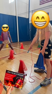 Spray The Fire Extinguisher 🚨Stick a juggling scarf inside cones to act as “flames.” Students use a cone with a jump rope inside as their “extinguisher,” pretending to spray the fire. Or, make it a partner activity where they twist their core and pass the cone back-to-back.